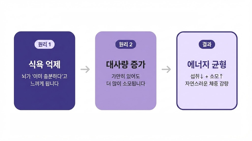 갈색지방세포(brown adipose tissue)를 활성화시킵니다. 갈색지방세포는 에너지를 열로 전환하는 특수 지방 조직입니다. 이 과정에서 기초대사량이 올라갑니다.