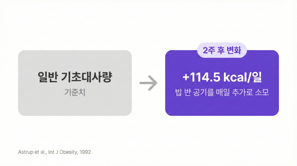 임상 데이터가 있습니다. 임상 연구에서 2주 후, 기초대사량이 하루 114.5 kcal 증가했습니다. (Astrup et al., Int J Obesity, 1992) 밥 반 공기(약 130 kcal)를 매일 추가로 태우는 셈입니다.